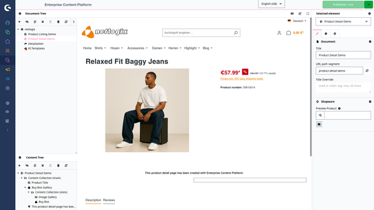 Bereits beim Bearbeiten kann das User-Erlebnis kontrolliert gestaltet werden – ohne stetiges Publishing als Ergebniskontrolle. Produktliste- und Produktdetailseite sind beim Editieren sichtbar (WYSIWYG).