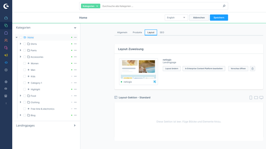 Kein ewiges Hin und Her zwischen verschiedenen Oberflächen, sondern alles im Blick und auf einen Klick. Einfach nur den "Edit"-Button im Backend klicken und schon geht´s los. Hier können Produkten und Kategorien die passenden Layouts zugewiesen werden, um sie dann im CMS zu verfeinern.
