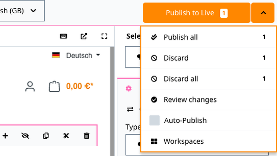Unter dem Publish-Button befindet sich ein Menü zum Veröffentlichen, angepasst an die jeweilige Rolle des Team Members. Dadurch sind strukturierte Workflows und Freigabeprozesse bis hin zu einem Vorschau-Link für die Anzeige des Seitenentwurfs ohne Login möglich.