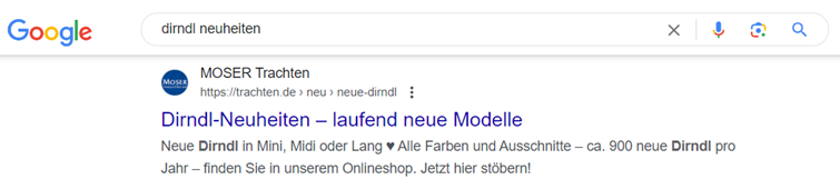 Das Snippet von MOSER Trachten bietet hilfreiche Infos, beispielsweise die Längen der Dirndl, und animiert zum Klick.