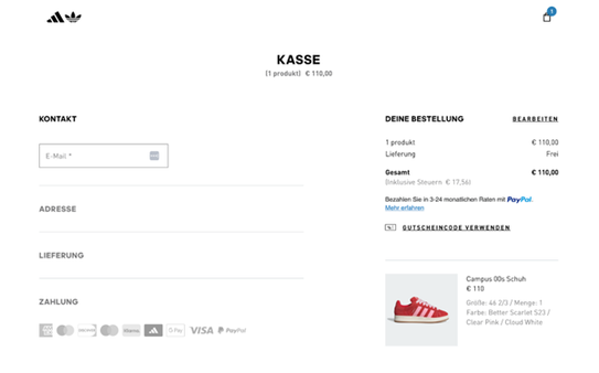 Adidas gliedert den Checkout-Prozess in vier klare Schritte. Die Kosten sind auf einen Blick ersichtlich und auch das Zahlungsportfolio deckt alle Bedürfnisse ab.