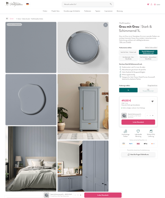 Wie aus dem Lehrbuch: Beim Online-Farbenhändler Miss Pompadour vermitteln großformatige Fotos einen guten Eindruck vom Produkt in verschiedenen Anwendungsszenarien. Ein Mengenrechner zeigt, wie viel Farbe bestellt werden muss, und bei Fragen steht der Kundenservice per WhatsApp zur Verfügung.